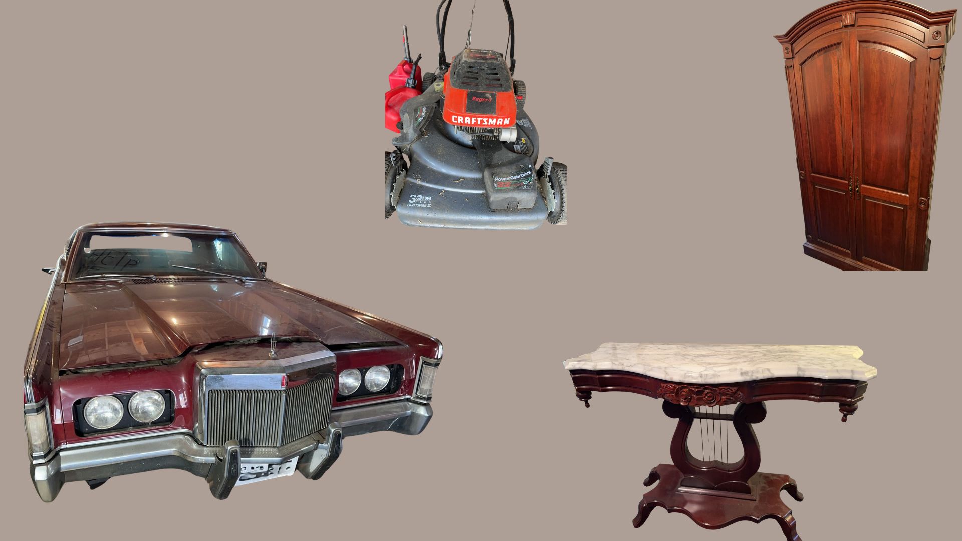 Featuring a 1970 Lincoln Continental Mark III, tools, furniture, household items, 8′ plastic tables (folding), marble top tables, lamps, Craftsman push mower 5.5hp and a 75″ Sony flatscreen TV (appears to be new in box – untested).